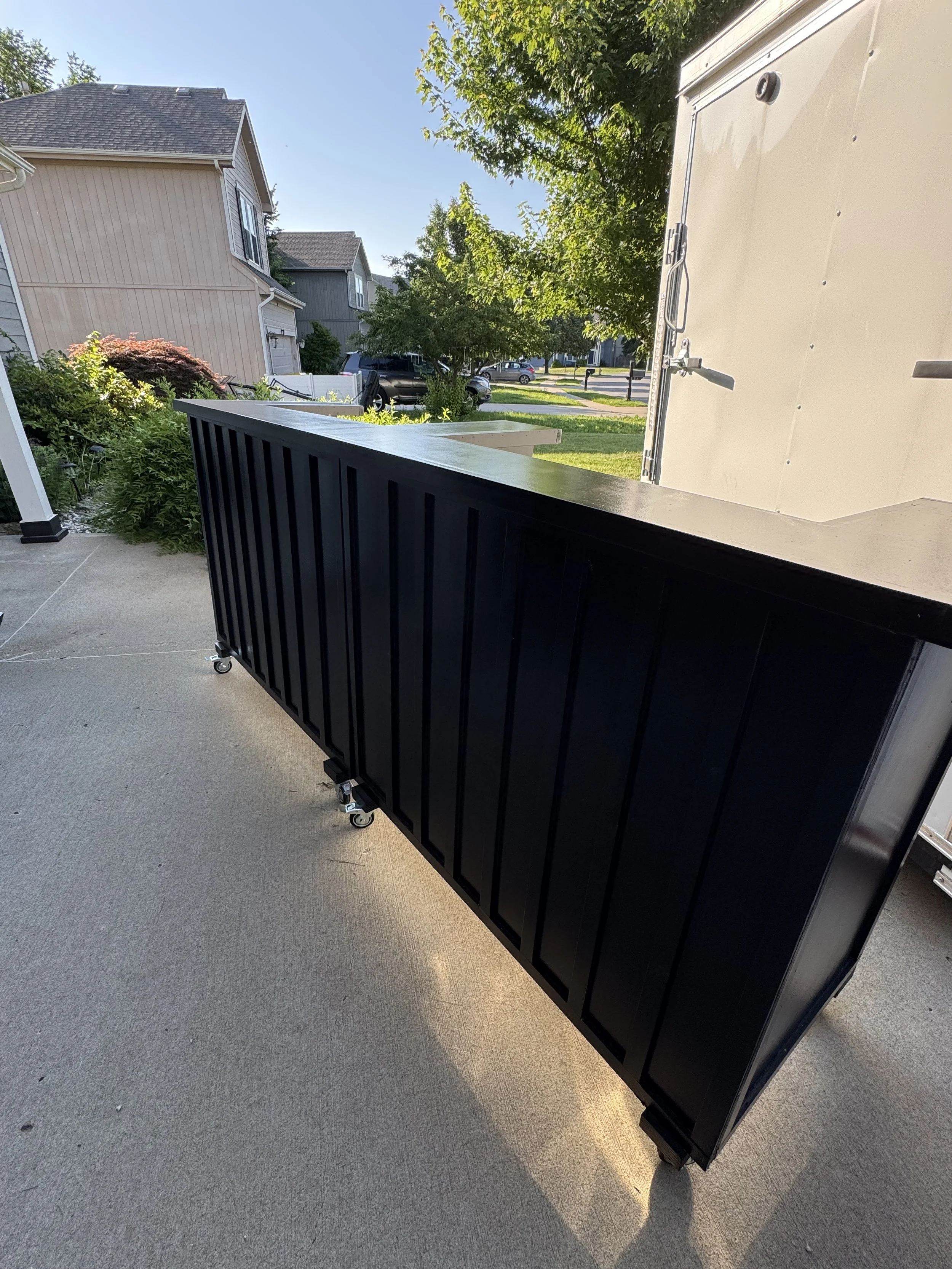 A sleek 8' all black bar that is perfect for two bartenders to operate behind!